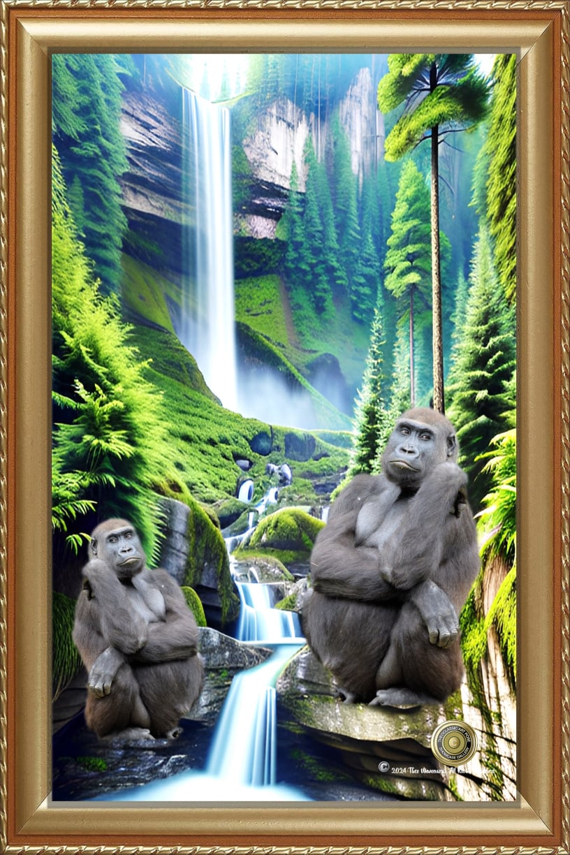 DESCRIPTION: TWO GORILAS POSED ON THE BACKGROUND AN EXOTIC MOUNTAIN WATERFALL.
